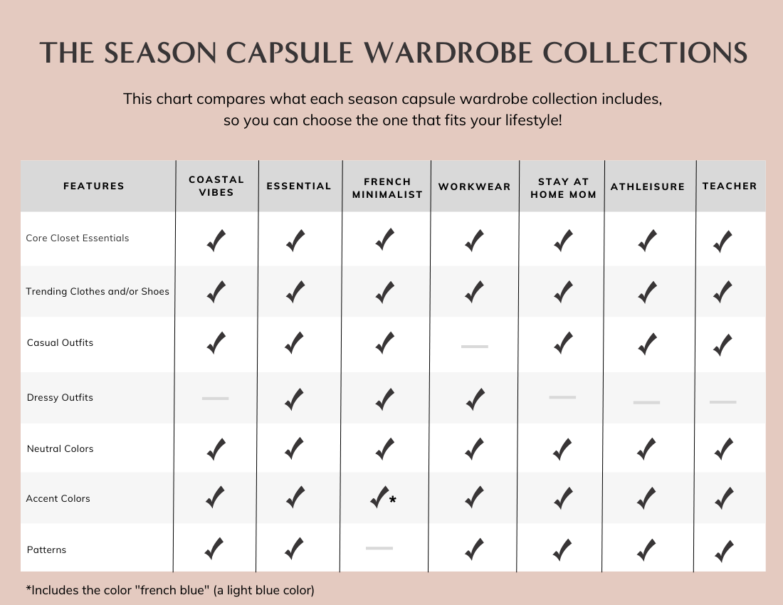 The Season Series capsule wardrobe collections are published four times a year for each of the seasons: Spring, Summer, Fall and Winter. Each collection uses mostly core closet essentials (basic wardrobe staples), plus a few trending clothes, shoes and/or accessories for the season. You save money by utilizing your basic essentials and rotating them each season! You will be in style every season, plus save money by utilizing your existing wardrobe too!