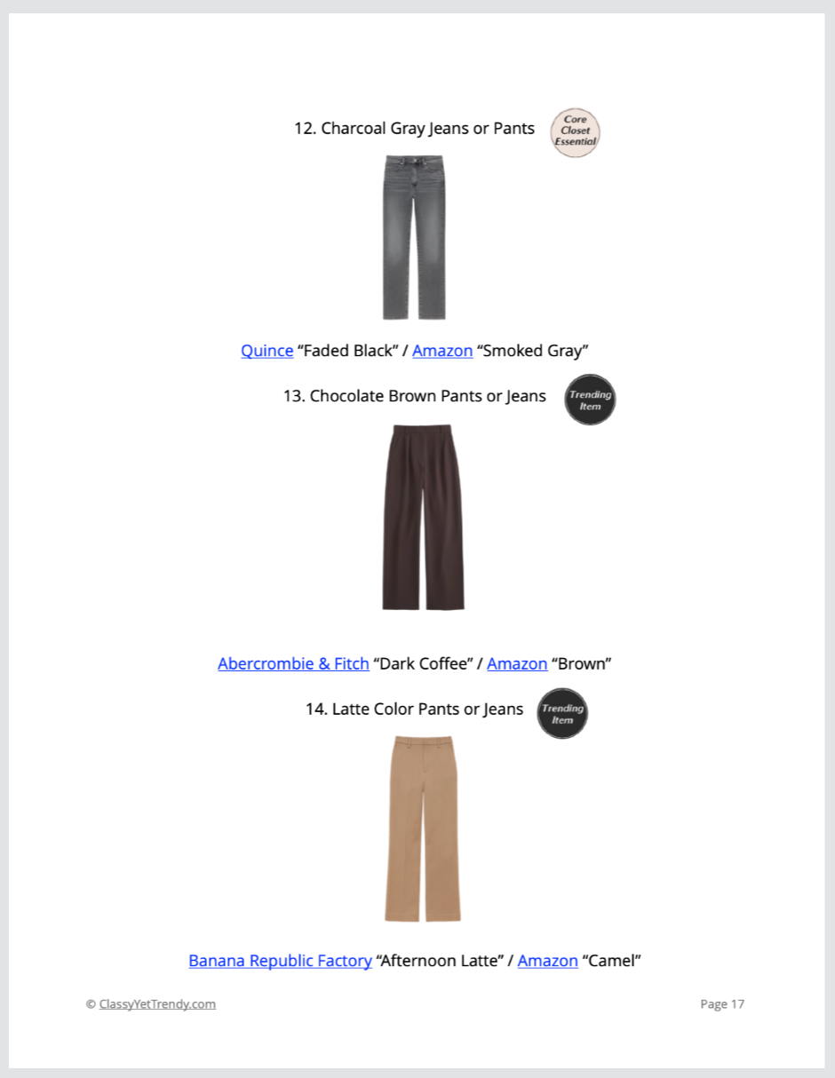 Nope! These capsules are designed to include mostly basic essential pieces. A few trendy pieces are included, but you can substitute pieces according to your lifestyle; plus, I’ll share with you an online site where you can search for 1,000s of clothes, shoes and accessories at dozens of retailers! You may already have several suggested clothes and/or shoes already in your closet! If you don’t have any of these and are on a budget, consider shopping for these at your local consignment shops, thrift stores or on poshmark.com or thredup.com.